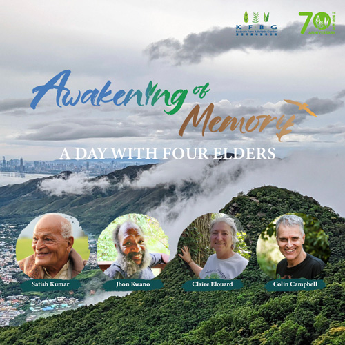 We are honoured to host at KFBG four esteemed elders, who will share the wisdom that has helped to shape our educational philosophy and approach over the past decades: Claire Elouard, Colin Campbell, Jhon Kwano and Satish Kumar. Each of these respected elders brings an important message for our times, offering insights on how to connect deeply with the energy of nature, lessons from indigenous knowledge and the wisdom of living with elegant simplicity while cultivating unconditional love for the Earth.