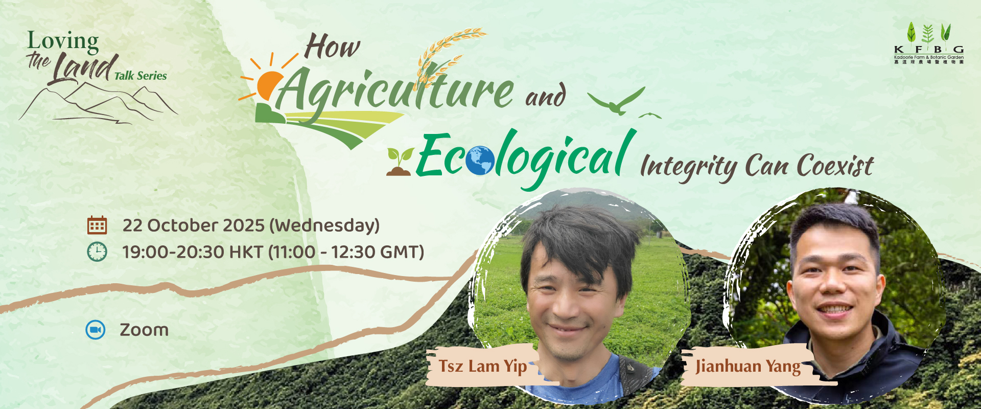 This talk draws on learnings and insights of the ongoing work at Kadoorie Farm and Botanic Garden: we welcome Tsz Lam Yip, from our Regenerative Agriculture Department, and Jianhuan Yang, from the Kadoorie Conservation China Department. Both speakers have extensive experience addressing farmland issues, with Tsz Lam focusing on ecological agricultural practices and Jianhuan on ecological scientific and research perspectives. In this dialogue, they will deepen the understanding of how agriculture and ecological integrity can coexist, promoting a holistic approach to land stewardship for a sustainable future.