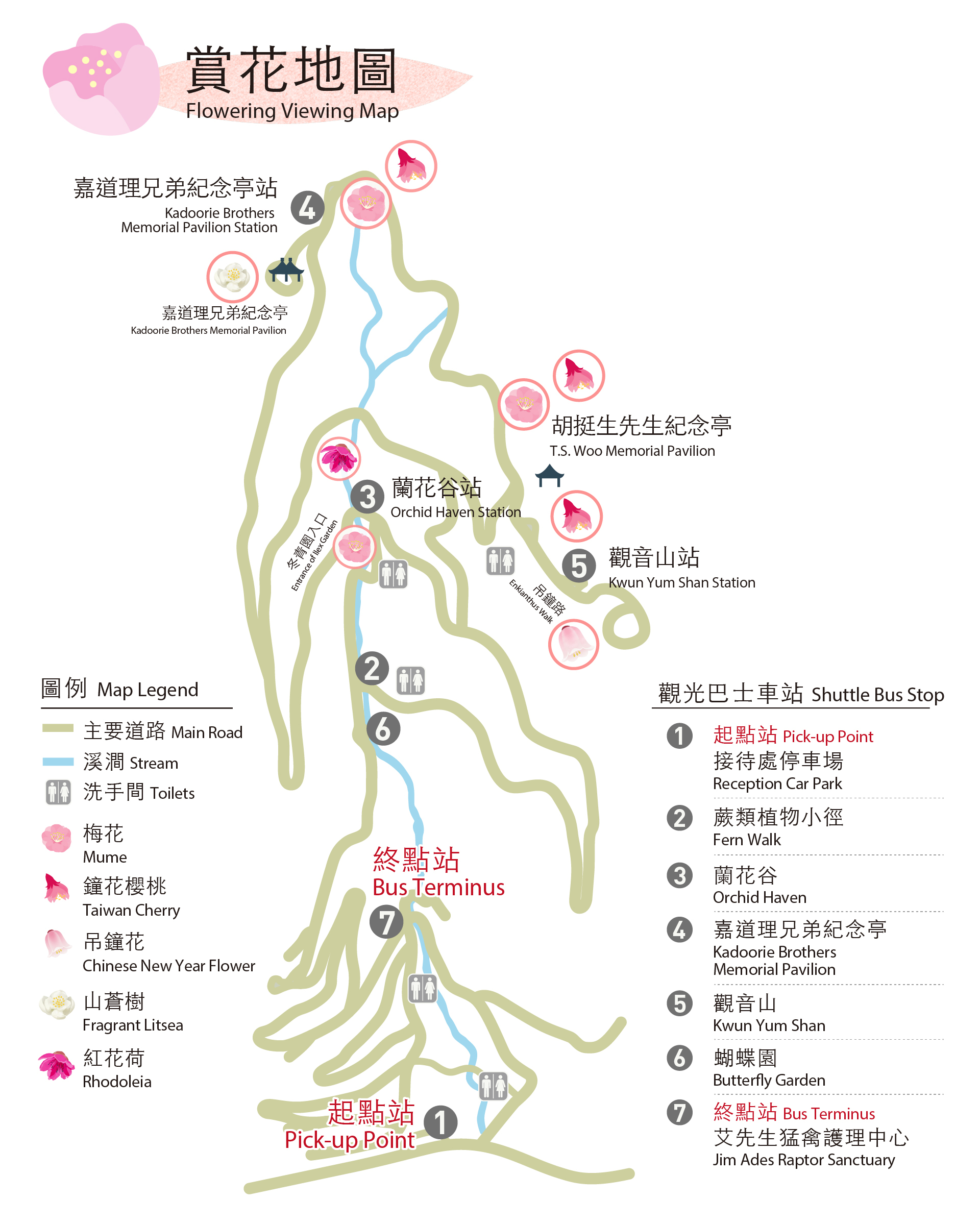 Flower Viewing Route: February✓ Visit T.S.Woo Memorial Pavilion Δ Reception at Kadoorie FarmPurchase tickets for the in-site shuttle bus at the reception and alight at the fifth stop: Kwun Yam Shan Station. Δ T.S.Woo Memorial Pavilion