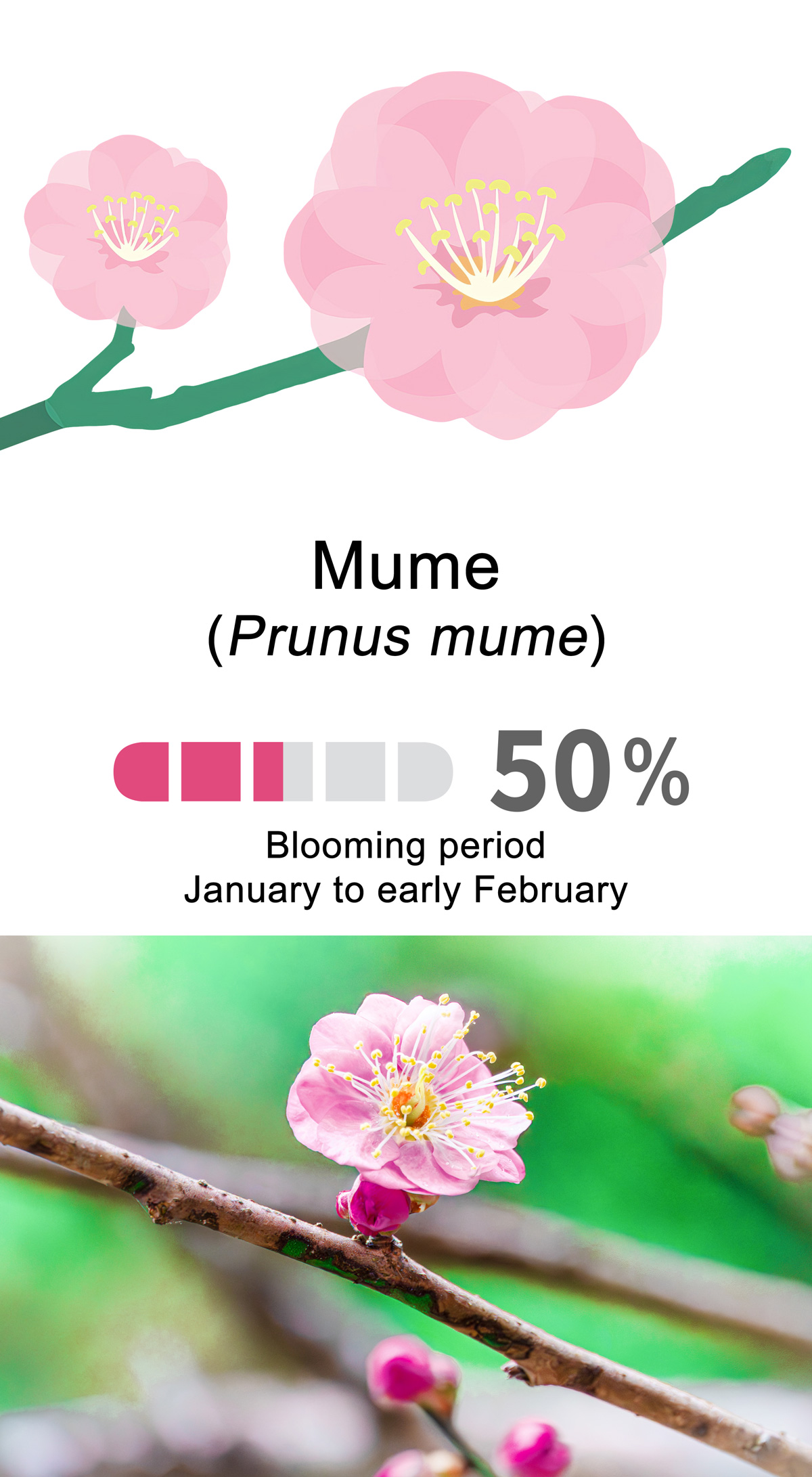The Mume (scientific name: Prunus mume) belongs to the Rosaceae family, genus, is a small deciduous tree characterized by " hysteranthy" (flowers appearing before leaves) The species have light pink or white blossoms that bloom in late winter and early spring. Mume is highly adaptable, preferring warm and dry climates but also possessing cold-resistant properties.