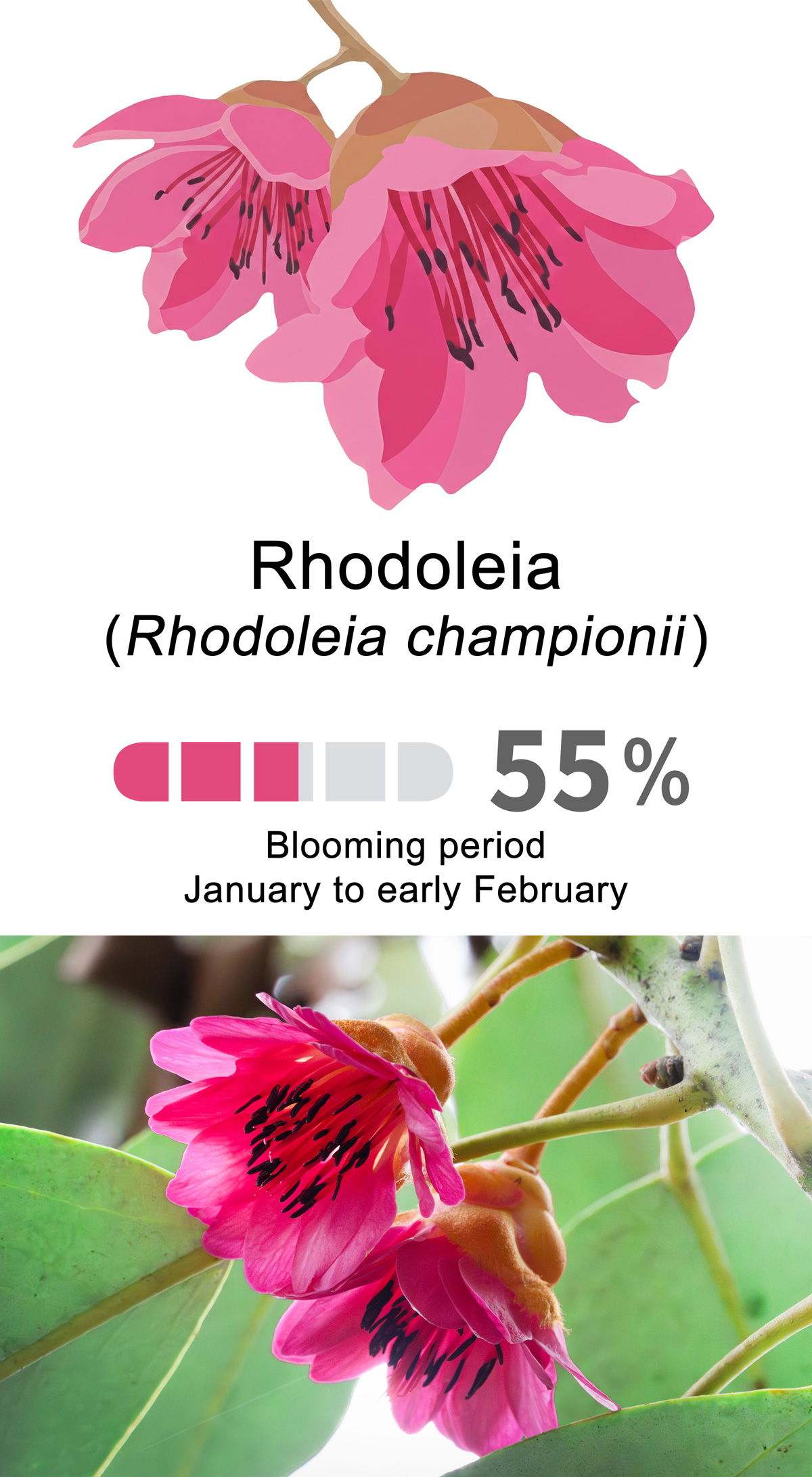 Flower Viewing Route: Late January to Early February✓ Overlook the northern Hong Kong scenery from the Kadoorie Brothers Memorial Pavilion Δ Reception at Kadoorie Farm & Botanic GardenPurchase tickets for the in-site Shuttle Bus at the reception and alight at the third stop: Orchid Haven. (Click here to check the shuttle bus schedule) Δ Orchid HavenIn addition to appreciating the rare trees in Orchid Haven, also enjoy the protected plant - Rhodoleia (Rhodoleia championii) - and the pink Mume (Prunus mume) located near the entrance of llex Garden.
