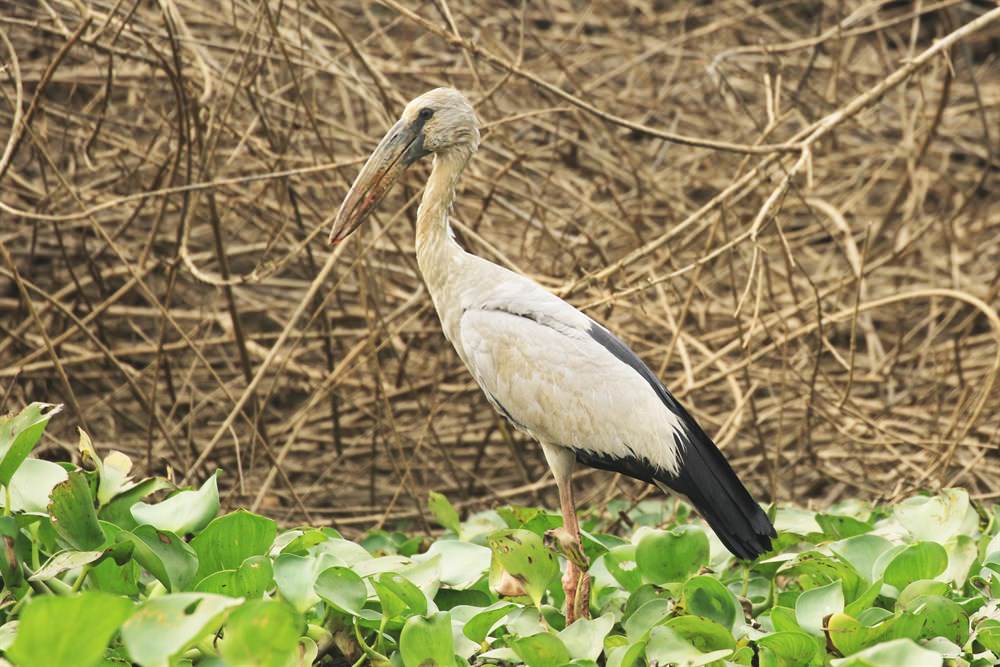 鉗嘴鸛與人類一樣愛吃螺,但大家用的餐具就截然不同。就餐時,這隻大型 涉禽會用呈蟹鉗夾子狀的「怪喙」來取食。 |